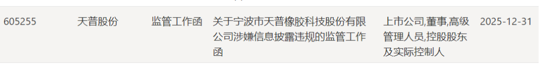 此前2025年12月31日,上交所已对天普股份(605255)发出监监职责函,处理事由为涉嫌信息表现违法。波及对象除公司外,还有董事、高管以及控股鼓吹及本色适度东说念主。