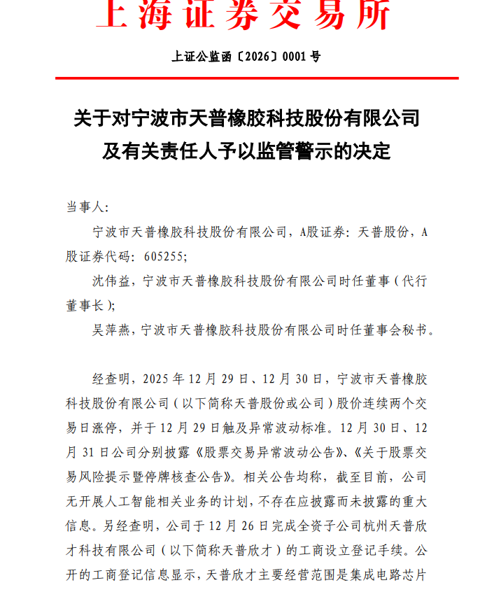 1月5日,上交所发布《对于对宁波市天普橡胶科技股份有限公司及干系背负东说念主赐与监管警示的决定》,这是2026年沪市首份监管警示决定书。
