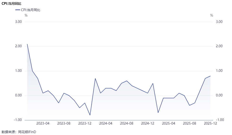 1月9日,国度统计局发布数据深刻,2025年12月份,宇宙住户浪费价钱(CPI)同比高涨0.8%。其中,城市高涨0.9%,农村高涨0.6%;食物价钱高涨1.1%,非食物价钱高涨0.8%;浪费品价钱高涨1.0%,劳动价钱高涨0.6%。12月份CPI同比增幅为2023年2月来新高。