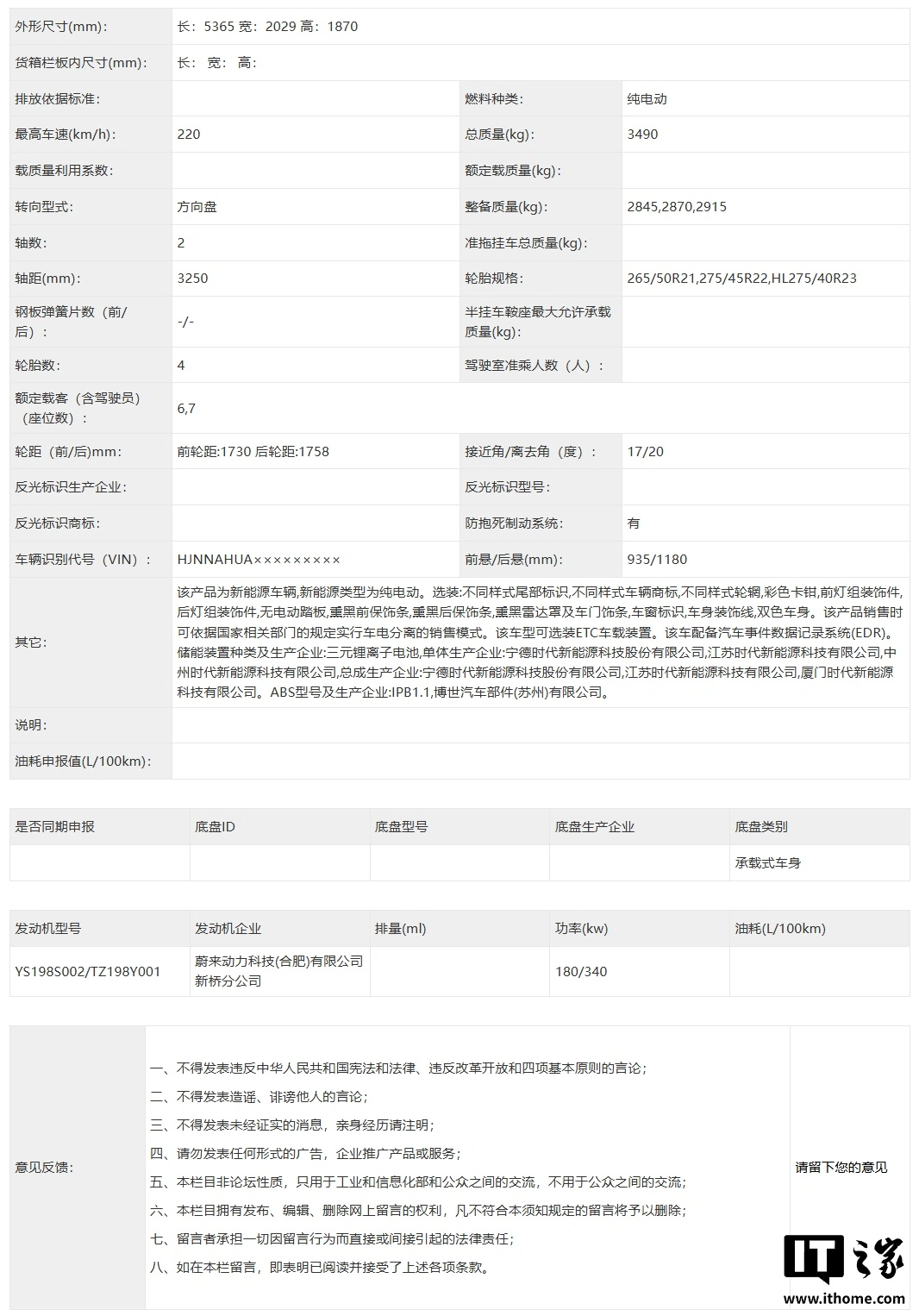 联系页面表示,该车尺寸为5365×2029×1870mm、轴距3250mm,最高车速220km/h,配备前180后340kW双电机,提供双色车身、大饼轮毂、275mm的23寸宽轮胎,车重2845/2870/2915公斤。