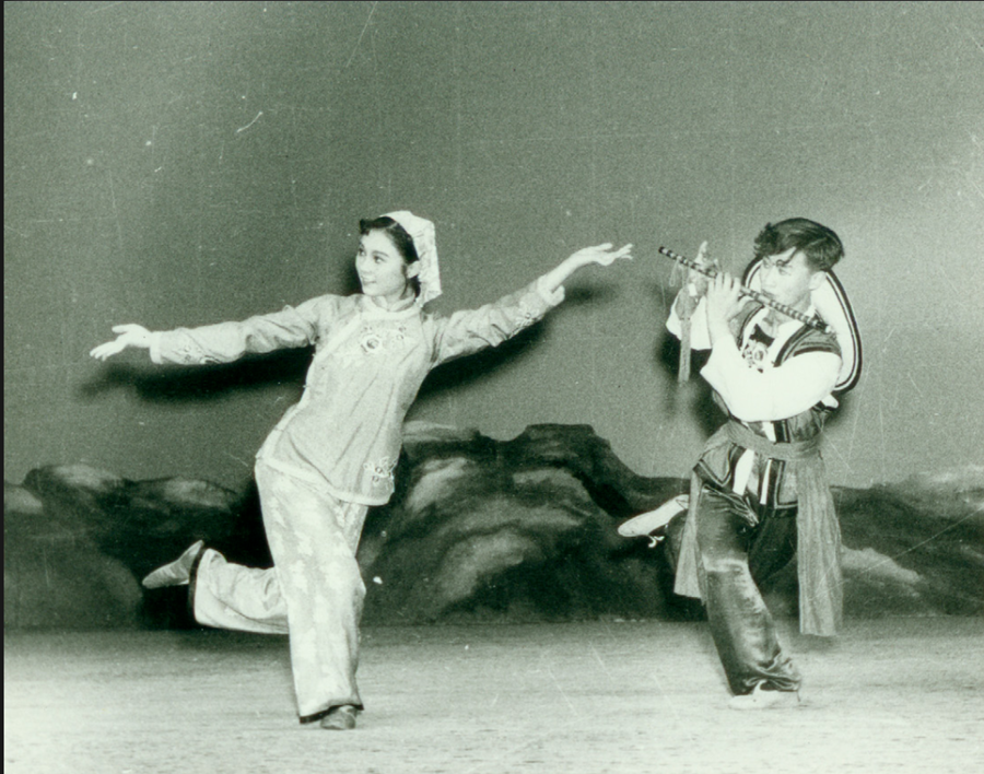 1957年,吕艺生与王佩英饰演双东谈主舞《牧笛》剧照。(府上像片)