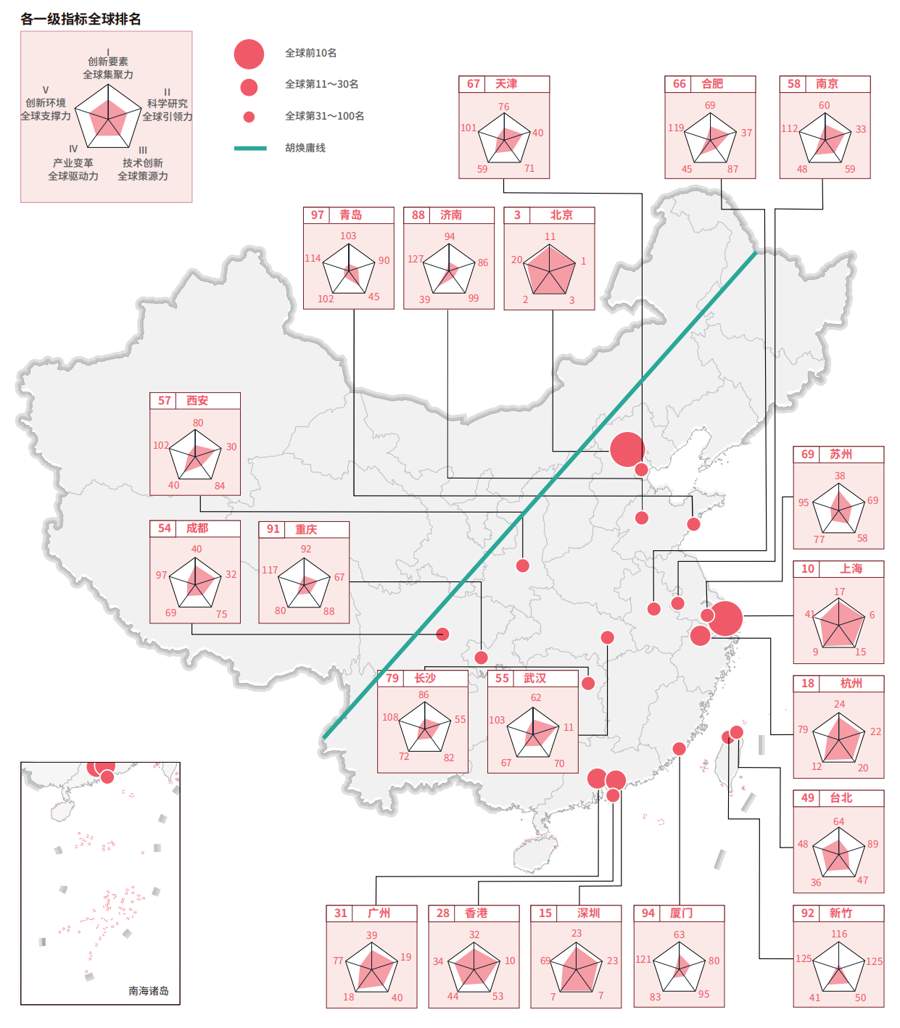 值得提防的是,干与人人百强的20个中国城市,一起位于胡焕庸线以东。其中,胡焕庸线东南侧的京津冀、长三角、粤港澳大湾区三大齐市圈集结了半数(10个)百强科创中心,且中国干与人人前30强的城市一起位于这三大齐市圈,这在短期内仍将是中国立异发展的主要空间格局。