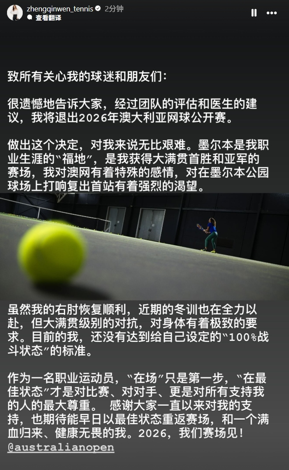 很缺憾地告诉公共,经由团队的评估和医师的提出,我将退出2026年澳大利亚网球公开赛。