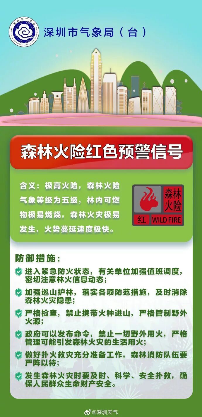 【深圳市丛林火险橙色预警信号升级为红色】深圳市丛林防熄灭指令部和深圳市气候台2026年01月03日08时30分将全市陆地丛林火险橙色预警信号升级为红色,瞻望我市天气将赓续干燥,丛林火险气候等第为五级,林内可燃物极易毁掉,丛林火灾极易发生,火势扩展速率极快,关系驾驭部门加大巡山护林力度,严格经管郊野火源。