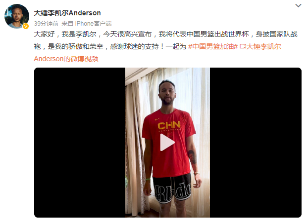 “中国球迷,寰球好,我是李凯尔。我很很稳定文牍,我将代表中国男篮出战全国杯,身披国度队战袍,是我的显示和庆幸,感谢球迷的救助!一皆为中国男篮加油。”李凯尔如是表态。