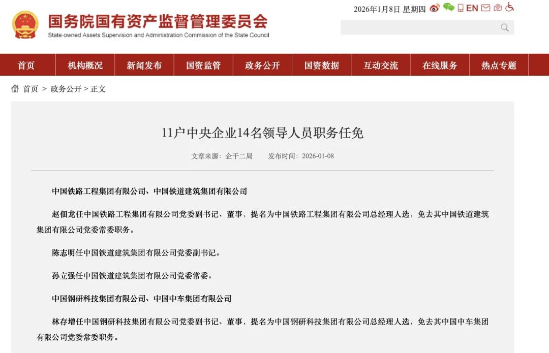 1月8日,国资委公布11户中央企业14名探求东谈主员职务任免。具体如下:
