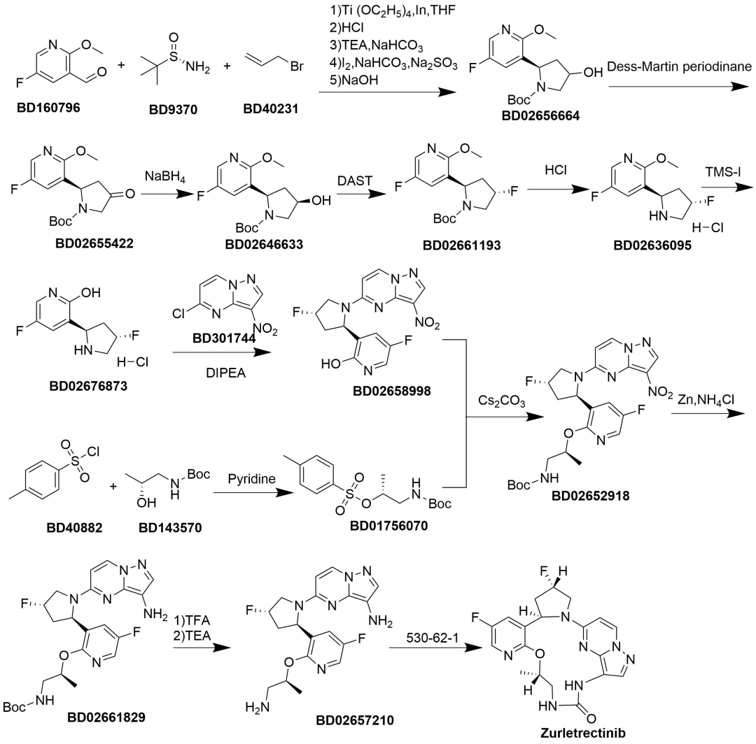 Zurletrectinib Zurletrectinib由北京诺诚健华医药科技有限公司研发,活性因素为佐来曲替尼(Zurletrectinib),商品名为宜诺欣,属于酪氨酸激酶阻拦剂。用于佩带NTRK交融基因的局部晚期或转化性实体瘤患者。获批时分为2025年12月15日。