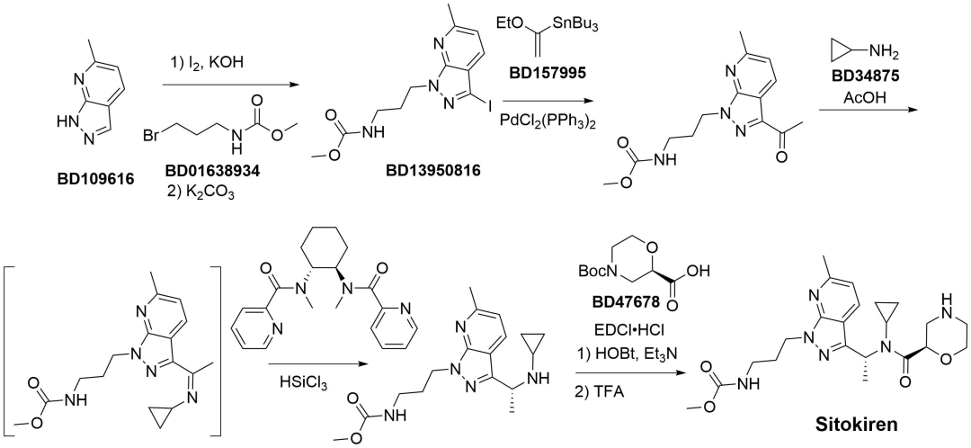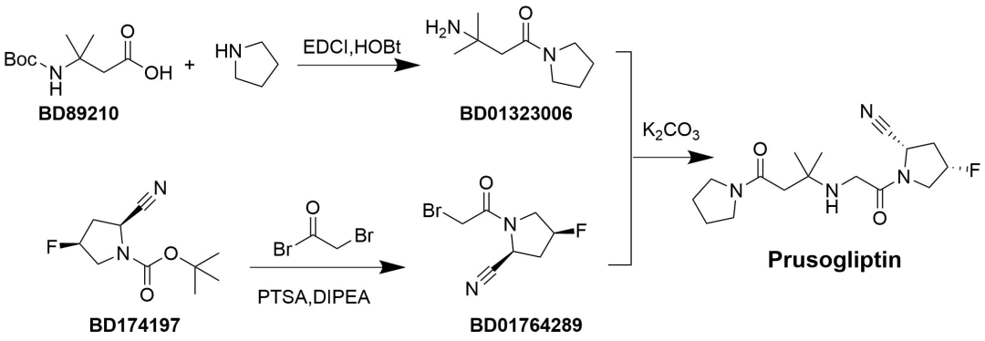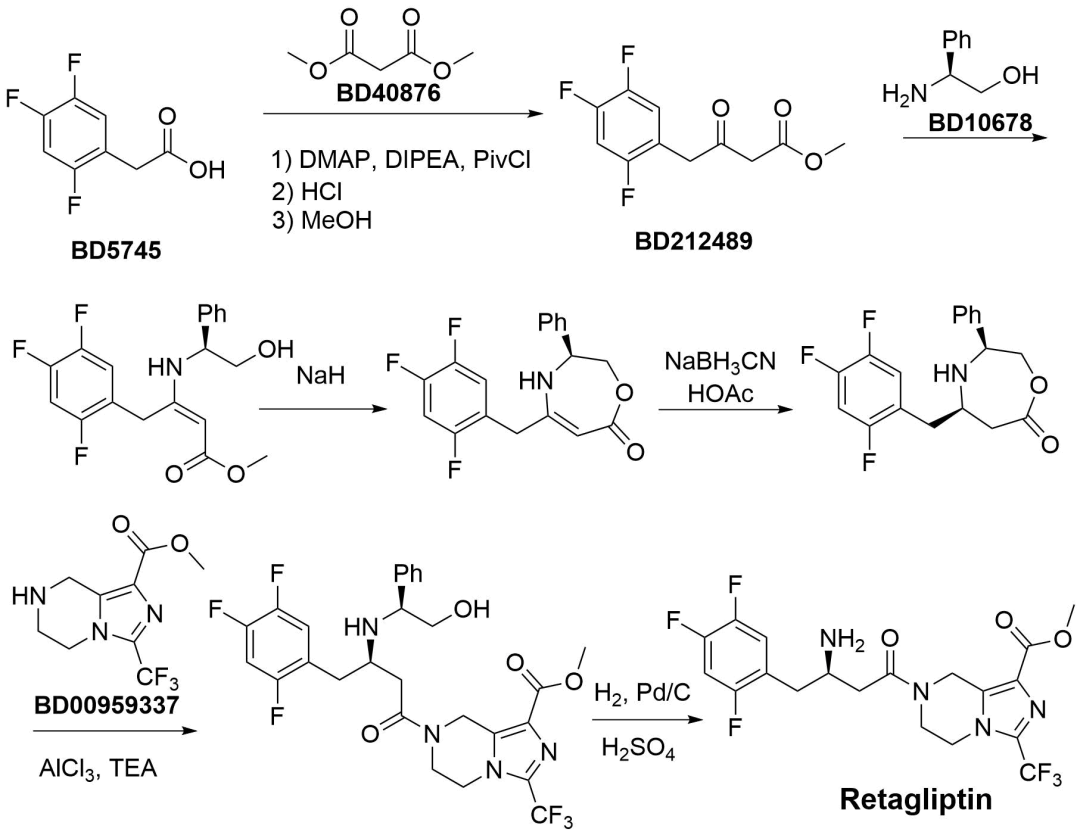 Retagliptin&Metformin Retagliptin&Metformin由山东盛迪医药有限公司研发,活性因素为瑞格列汀二甲双胍(I)/(II),商品名为瑞霖唐,是瑞格列汀和二甲双胍复合制剂。适用于适合经受磷酸瑞格列汀和盐酸二甲双胍诊疗的2型糖尿病成东说念主患者改善血糖完毕。获批时分为2025年5月22日。本文先容瑞格列汀的合成。