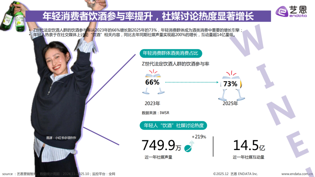 《讲演》明晰揭示了年青东谈主在酒类浮滥市集的核心肠位,Z世代已成为当之无愧的主力军。数据骄贵,2025年Z世代法定饮酒东谈主群的饮酒参与率已从2023年的66%擢升至73%,短短两年间杀青显耀增长。与此同期,年青东谈主在酬酢媒体上对“饮酒”话题的征询怜惜空前飞扬,关系声量同比增长超200%,互动量更是破坏14亿大关,酿成宽阔的公论影响力。