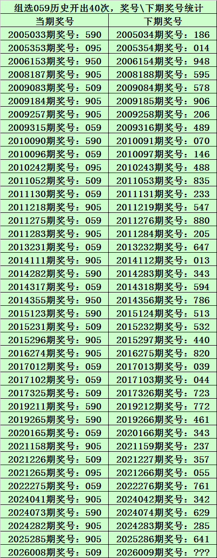 二、组选059分析:摆设三历史上已开出40次组选号码059了,其奖号和下期开出奖号统计如下: