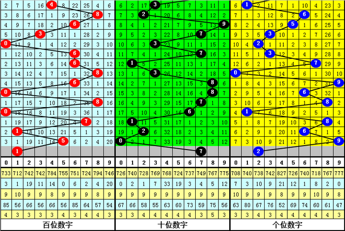 第二位3-6之间的中号开出9个,现在遗漏3期,其中号码4出现0次,现在遗漏33期;号码5出现2次,现在遗漏19期;号码3出现4次,现在遗漏7期;号码6出现3次,现在遗漏3期。