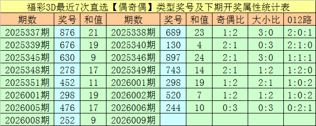 开奖追想:福彩3D第2026008期开奖号码为252,奖号直选类型为:偶奇偶、小大小和222路。