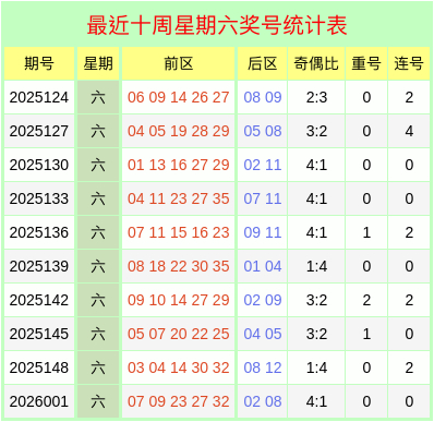 本期在星期六进行开奖,凭据上方【最近十个星期六奖号统计表】可知,上周六前区奖号为07、09、23、27、32,奇偶比为4:1,最近十个星期六开出的前区奇偶比为29:21,本周六展望奇偶比为2:3。