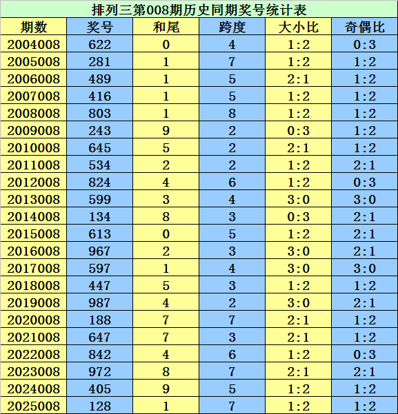 从2004年于今摆设三已开出7482期奖号了,本期为摆设三2026年第008期开奖,历史同时已出现22次奖号: