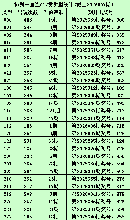 上期转头:体彩摆列三第2026007期开出奖号:126,其012路比为1:1:1,奖号012路类型为:120。