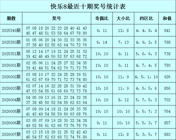 福彩怡悦8第2026007期开奖讲求:03 13 15 18 20 21 25 32 42 43 45 54 57 62 63 68 72 74 76 80,其中奖号四区比为5:3:5:7,奇偶比为9:11,大小比为12:8,和值为883。