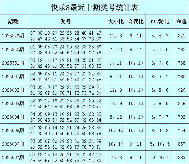 福彩自得8第2026007期开奖回想:03 13 15 18 20 21 25 32 42 43 45 54 57 62 63 68 72 74 76 80,其中奖号奇偶比开出9:11,大小比开出12:8,012路比开出10:4:6,和值为883,跨度为77。