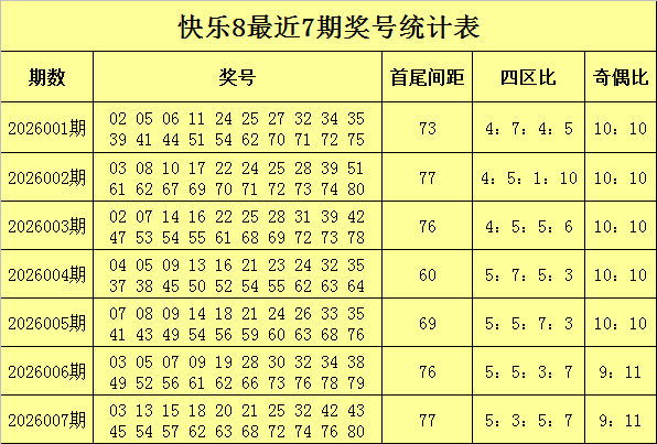 第四区【61-80】分析:上期较热出现7个奖号62 63 68 72 74 76 80,奖号奇偶比为1:6,偶数号码开出比例较高,最近7期该区奖号奇偶比为16:25,偶数号码推崇相对较热,本期温雅该区偶数号码62 64 66 72 78,参考该区奇数号码73。