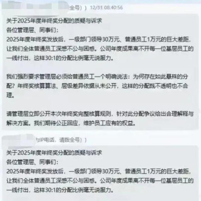 刘凯日前在公司里面群上发的信息 图片来自:收罗本日,每经记者和网传视频中的被打一方刘凯取得了磋议。刘凯向记者详备回报了事件始末。他袒露,申万期货的年终奖正本由三部分组成:每个季度预留的20%绩效、四季度绩效及年终专项奖励,公司昔时齐会在当年12月31日披发当年年终奖,他自2021年入职3年一直如斯。但2024年公司倏得停发年终奖,仅在2025年2月补发了9000元“过节费”;2025年12月31日披发的年终奖,他仅拿到1万元,而2023年同时披发金额为5万元,缩水近或者。此外,公司每年获评期货双A评级后齐会披发的1万元专项奖励,2025年也未竣事。“咱们等闲职工平时每个月平直工资惟一几千块,在上海根底不够生存,全靠年终奖补贴家用。”刘凯暗示,2024年公司董事长换届,当年停发年终奖时,公司措置层给出的原理是“中投公司有新礼貌,奖金披发不得源泉公司利润的6%,未发的奖金公司会为大家争取”,但一年昔时,公司2024年的年终奖励依旧莫得落实,2025年的奖励也遭到了大幅度的削减,与公司连年来较为牢固的缠绵功绩酿成了显然的反差。