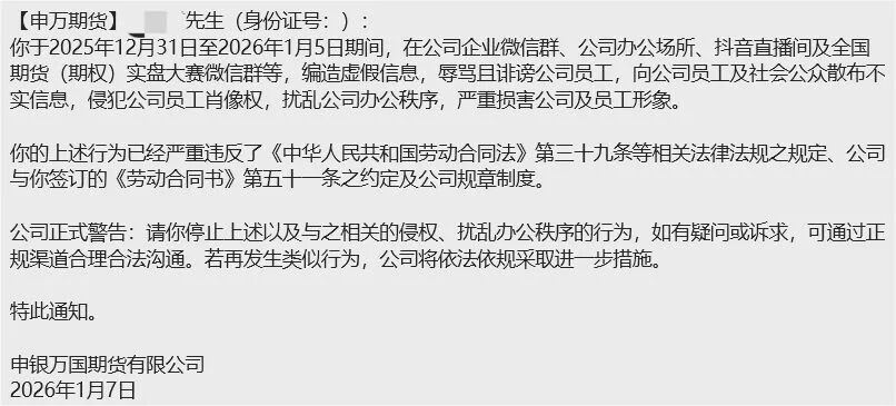 针对刘凯的探究作为,申万期货在1月7日发出的告诫信中称,其“在公司企业微信群、公司办公形式、抖音直播间及天下期货(期权)实盘大赛微信群等,诬捏失实信息,诅咒且申斥公司职工,向公司职工及社会公众散播作假信息,侵犯公司职工肖像权,滋扰公司办公次序,严重损伤公司及职工形象”,已严重违背服务公约法及公司王法轨制,条件其住手探究作为。但刘凯反驳称,我方的诉求不乏事实依据,直播实践果真记载了交涉经过,不存在失实信息,所谓侵犯肖像权亦然无从谈起,公司的说法站不住脚。