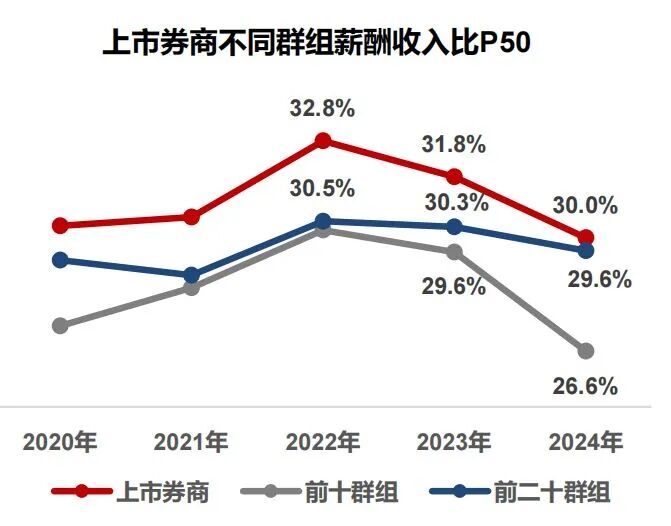 事实上,从薪酬收入比的角度来看,连年来,证券行业控薪力度确有加强趋势。据某斟酌公司统计,从薪酬总数参预来看,2022年由于证券行业收入利润范围受到冲击,上市券商薪酬总数占收入比均值达到峰值,而近两年跟着收入范围的回升和东谈主员范围的管控,薪酬收入比均值抓续下落,2024年前十、前二十上市券商薪酬收入比均值已回落到30%以下水平。