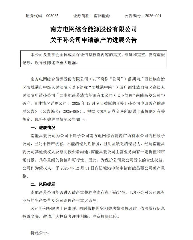 南能昌菱公司为公司下属子公司南边电网概括动力广西有限公司的控股子公司,已处于停产情景,不成归赵到期债务,且赫然枯竭归赵才智。经与南能昌菱公司其他债权东谈主及意向投资者疏通,南能昌菱公司主贸易务尚有一订价值和市集出路,具备重组的价值和可行性。因此,为保护公司及公司推动的正当权利,公司当作债权东谈主,于2025年12月31日向防城港中院央求南能昌菱公司歇业重整。