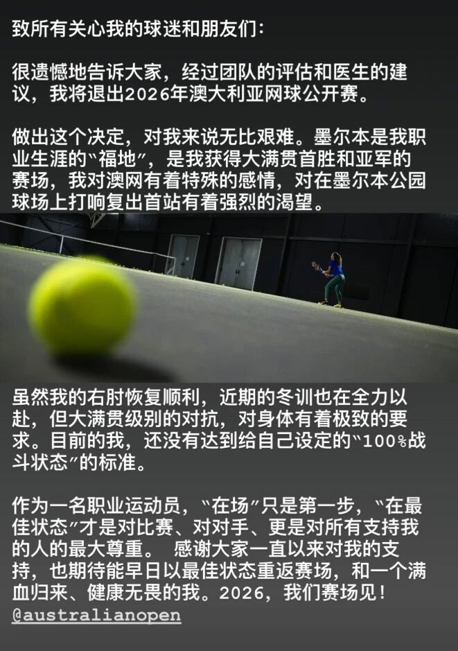 很缺憾地告诉全球,过程团队的评估和医师的提议,我将退出2026年澳大利亚网球公开赛。