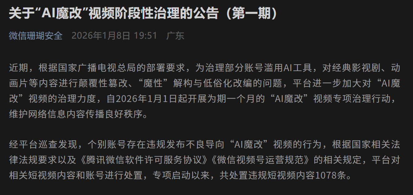 舍弃 2026 年 1 月 8 日,抖音平台累计责罚涉“AI 魔改”违法视频 1075 条。