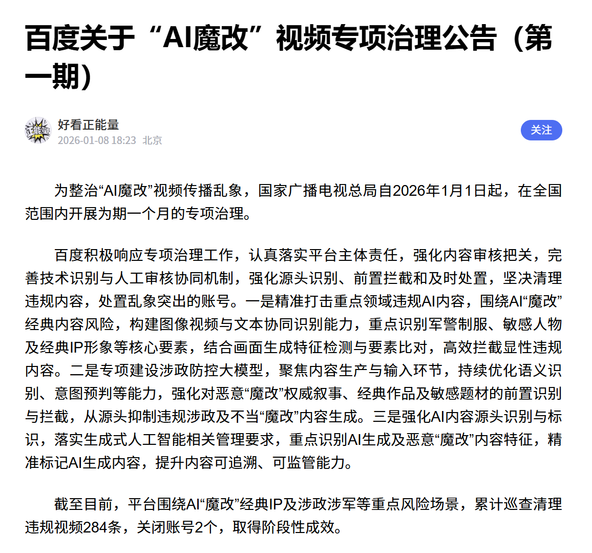 百度平台围绕 AI“魔改”经典 IP 及涉政涉军等要点风险场景,累计查察算帐违法视频 284 条,关闭账号 2 个。