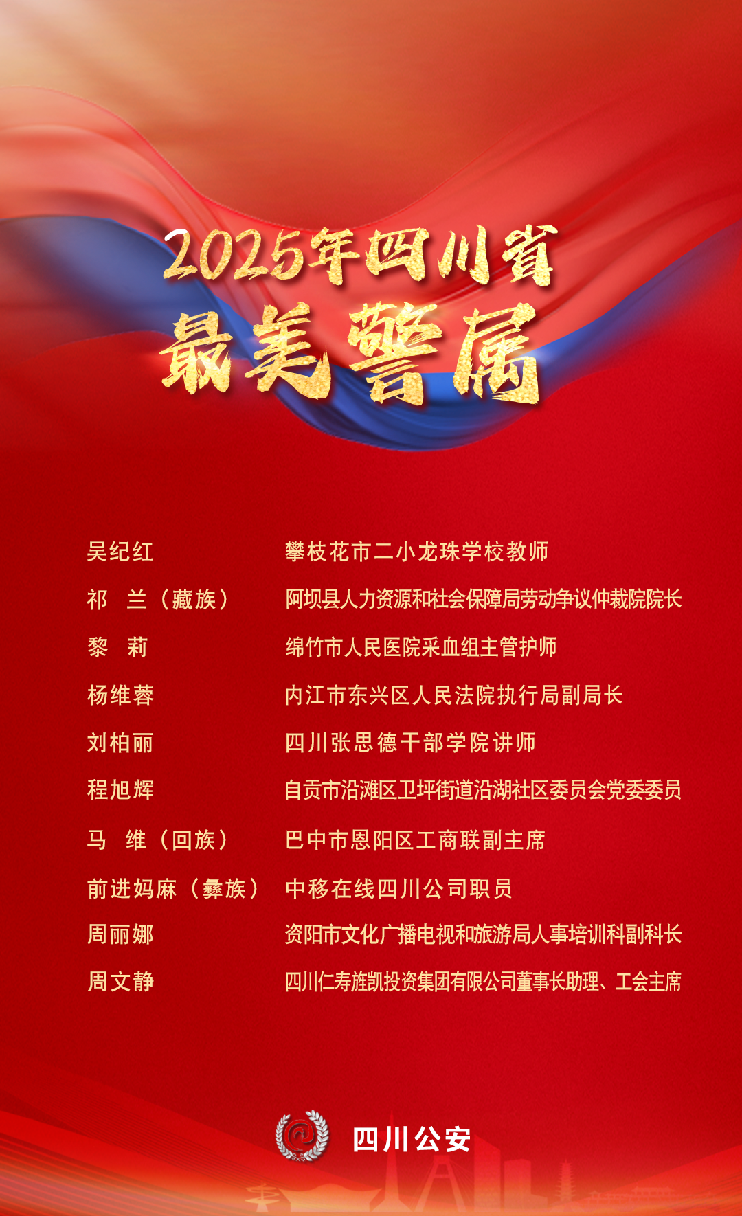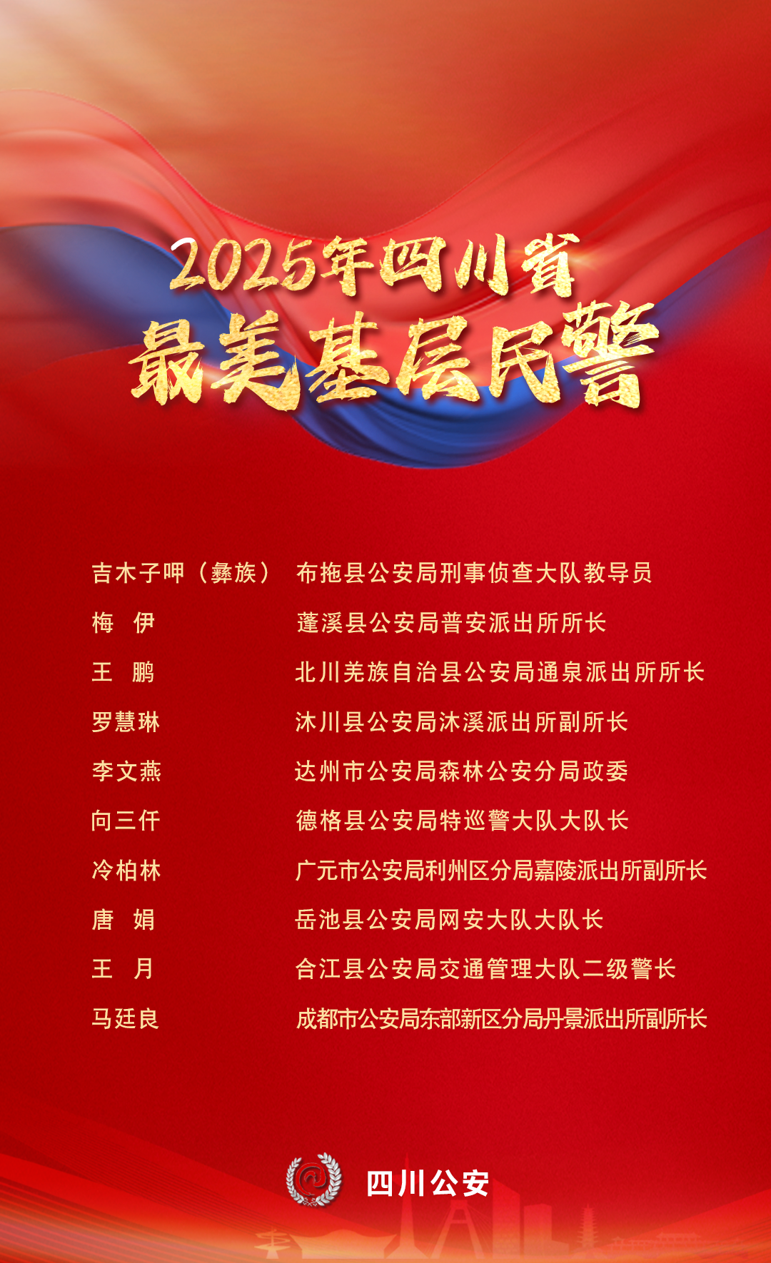记者现场了解到,过程多轮推选和评审,中共四川省委宣传部、四川省公安厅决定授予吉木子呷等10名同道2025年四川省“最好意思下层民警”名称,授予吴纪红等10东谈主2025年四川省“最好意思警属”名称。