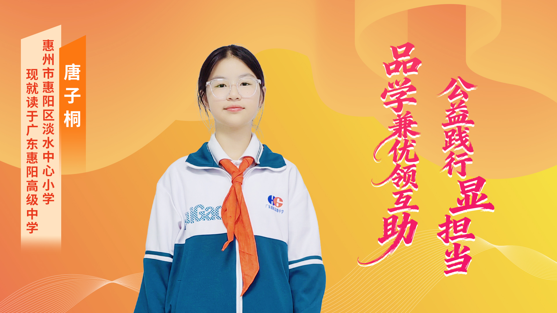 唐子桐,女,广东惠阳高等中学七年龄(14)班班长、学生会学习部委员。她品学兼优,全面发展,流畅多年获校级“三勤学生”“优秀班干部”等荣誉,并先后入选2024年惠州市“新时期好少年”,荣获惠州市“良习少年”旭日奖、“红围巾奖章”个东谈主三星章、惠阳区优秀学生等称呼。她在话语艺术方面推崇凸起,屡次在国度级、省级朗读比赛中取得“朗读金星”“不凡之星”等奖项,参演的红色儿童剧亦获市级荣誉,是师生公认的优秀学生代表,2025年入选广东“新时期好少年”先进业绩发布名单。