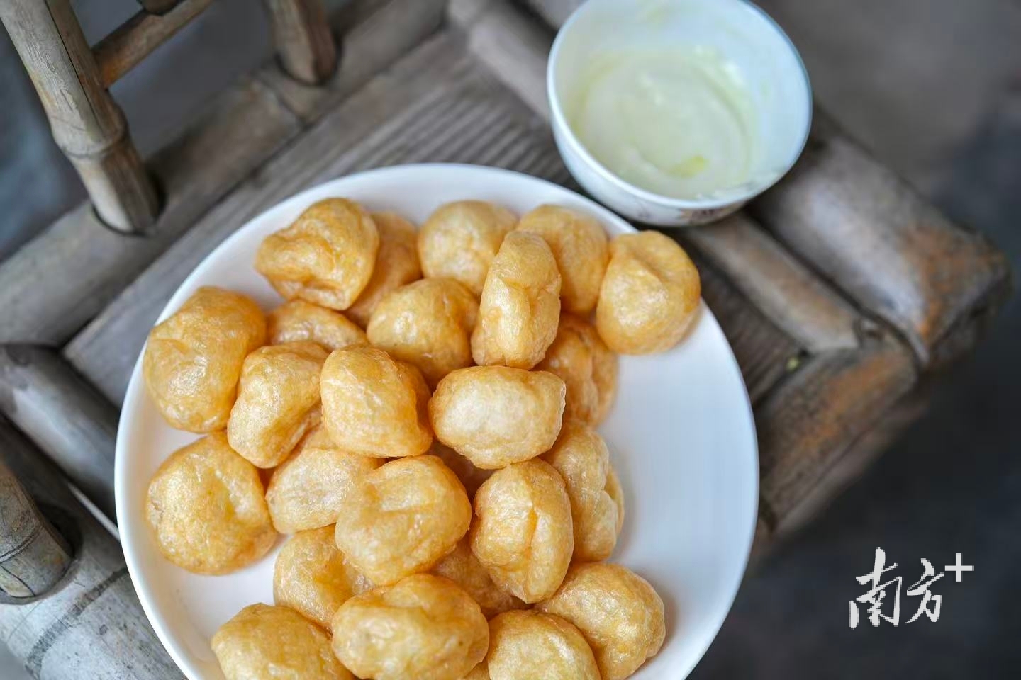 金黄动听,薄如蝉翼,目下这盘小圆球是什么东西?油面筋?豆腐泡?不不不,它等于老广“打边炉”的忠良食材——罗定皱纱鱼腐。