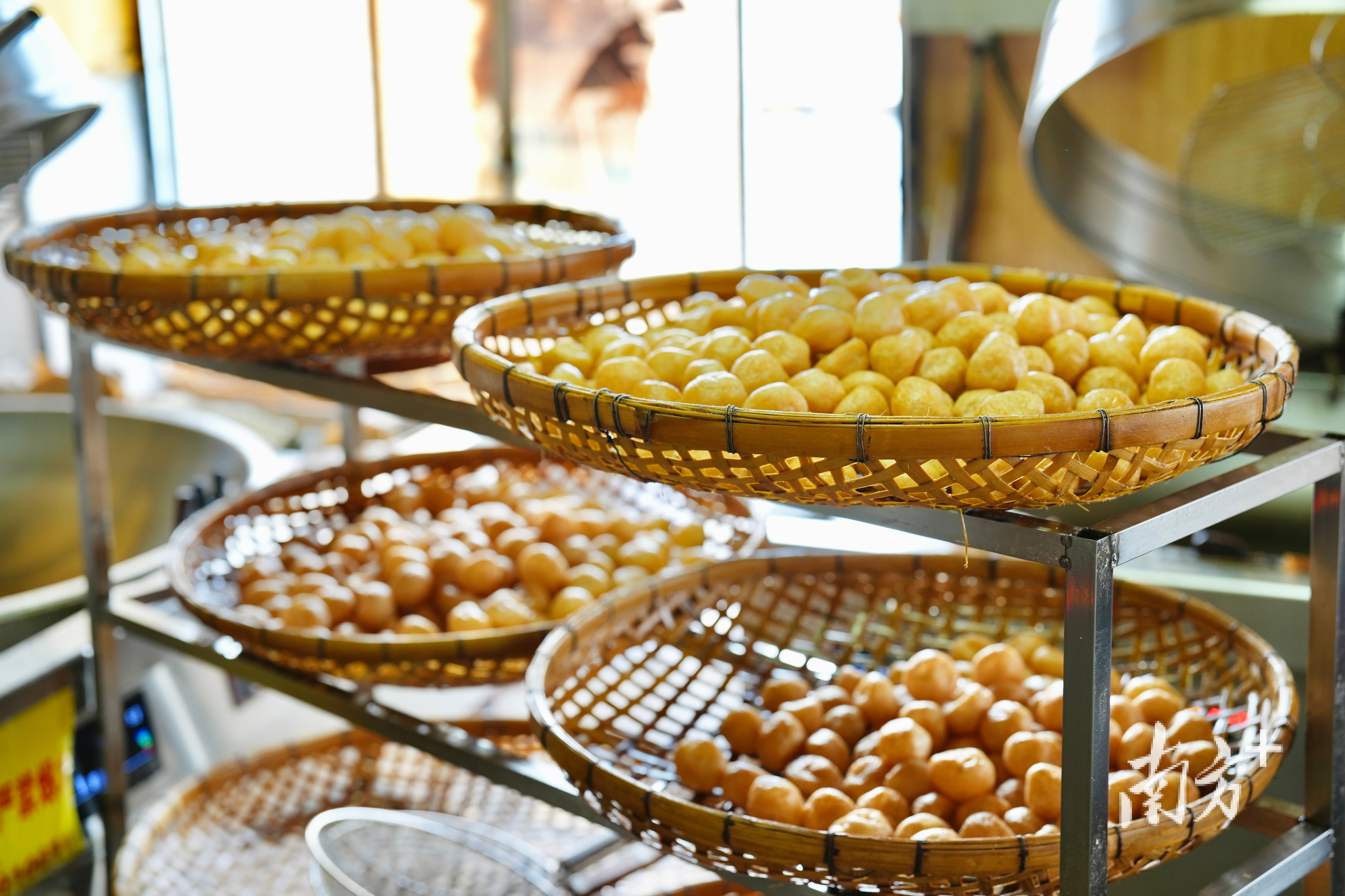 合手成球状的鱼腐放在花生油里,很快就泛起诱东谈主的金黄光泽。卢德宣布诉记者,适度油温是作念鱼腐的重要:“炸的时刻要有耐烦,要比及油温冉冉升到150度,不然鱼腐会炸开。”