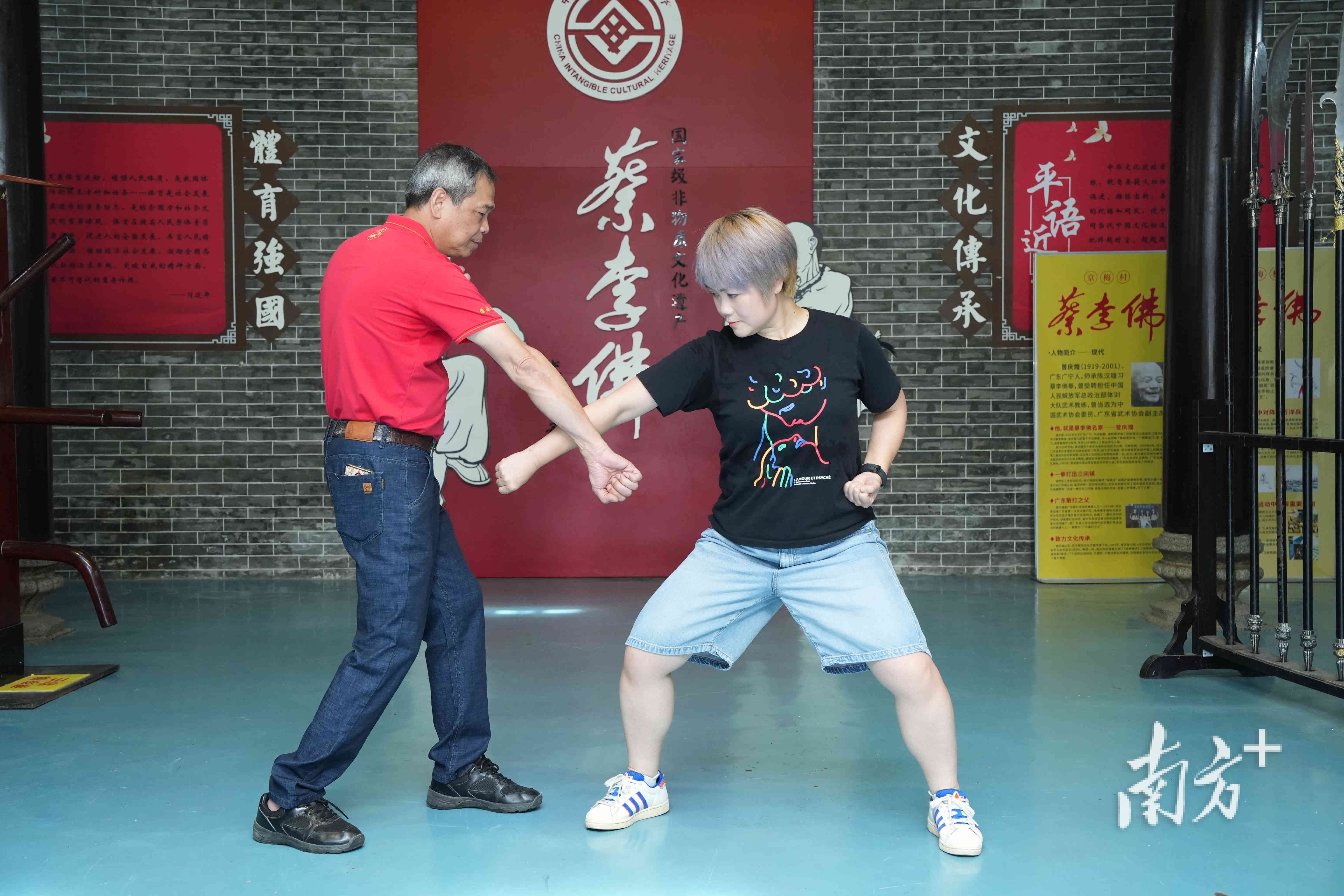 蔡李佛拳国度级非遗传承东说念主陈忠杰(左)在提醒记者。