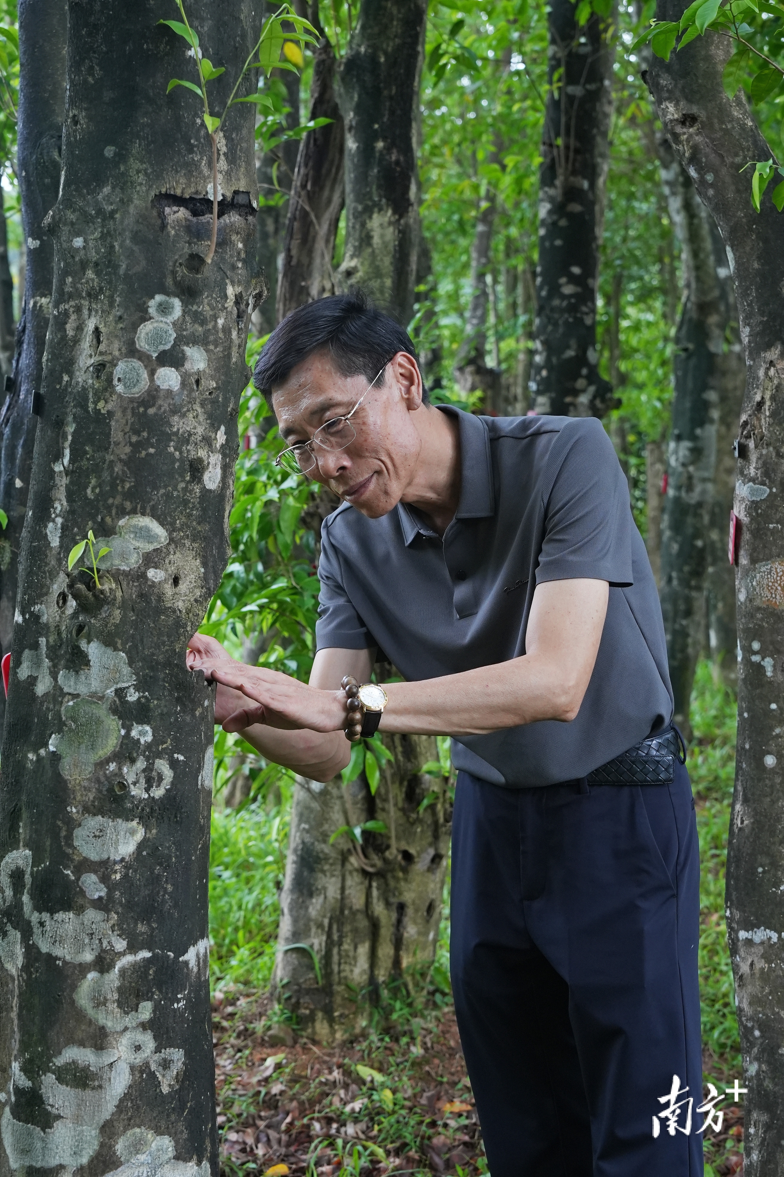站在栽植园内的一棵百年莞香母树前,黄欧指着树干上的一处切口说谈:“莞香树自己莫得香气,它的香气源于‘开香门’后造成的‘伤口’,这亦然莞香制作身手中的中枢要领。”