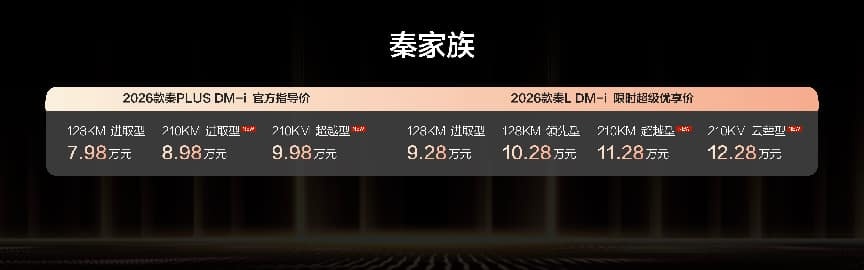 1月8日,比亚迪秦家眷迎来重磅加推,2026款秦L DM-i /2026款秦PLUS DM-i 210KM长续航版双车同步上市,售价8.98万元—12.28万元。其中,2026款秦L DM-i 210KM长续航版限时优享价11.28万元—12.28万元,2026款秦PLUS DM-i 210KM长续航版售价8.98万元—9.98万元。