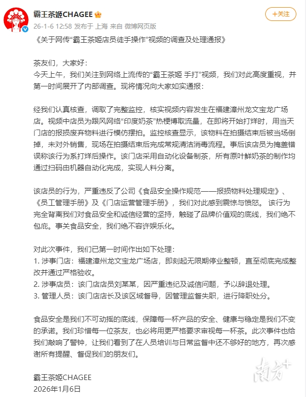 霸王茶姬调取竣工监控,核实视频本色发生在福建漳州龙文宝龙广场店。视频中伴计为跟风网罗“印度奶茶”热梗博取流量,在行将驱动打烊时,用今日门店的报损摒弃物料进行效法摆拍。