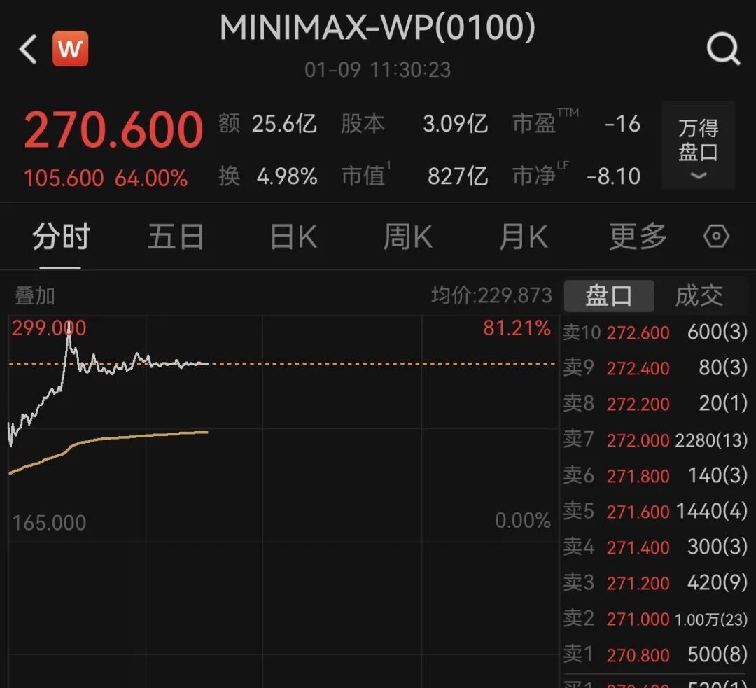 随后涨幅有所回落,收尾11:30分,MiniMax报270.6港元/股,涨64%,总市值827亿港元。以盘面价钱计算,此前申购MiniMax的中签者每手20股,不计手续费,一手将赚超2100港元。
