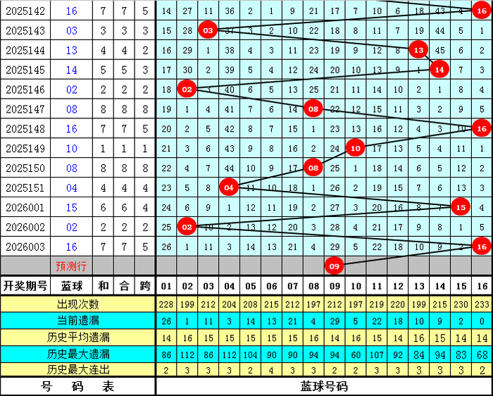 上期开出蓝球号码16,该号码在最近300期中出现了24次,其下期分歧开出:蓝球05出现3次,蓝球01、03、04、08、10、11、13出现2次,蓝球02、06、12、14、15、16出现1次,蓝球07、09出现0次。本期五码蓝球参考04、09、12、14、15,独蓝温雅09。