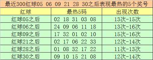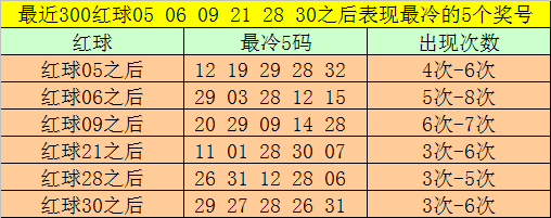 红球冷码统计:双色球第2026003期开出红球奖号分歧为:05、06、09、21、28、30,在最近300期开奖中,各号码出现之后其下期出现最少的5个红球分歧为: