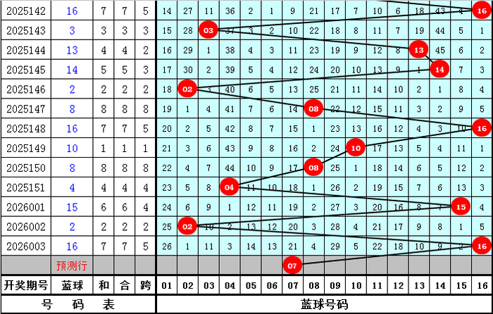 福彩双色球第2026003期开奖号码为:05 06 09 21 28 30 + 16。红球三区比为3:1:2,奇偶比为3:3,012路比为4:1:1,和值为99,蓝球开出1路号码。