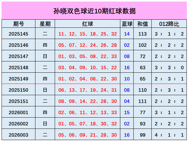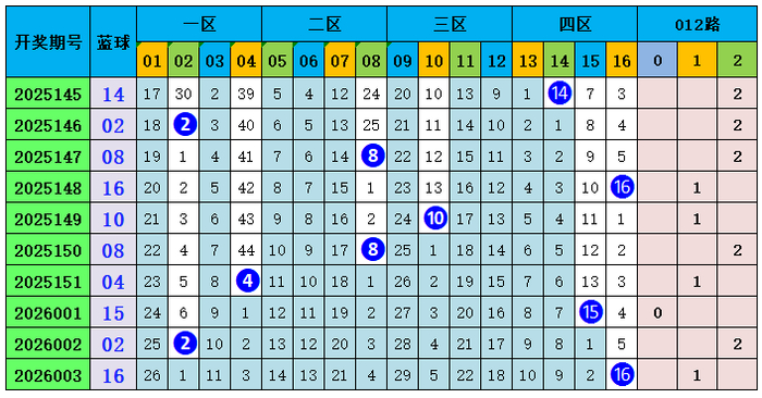 上期回归:双色球第2026003期开出奖号:红球05、06、09、21、28、30;蓝球16,其中红球和值为99,012路比为4:1:1,奇偶比3:3,蓝球开出大偶数号码16。
