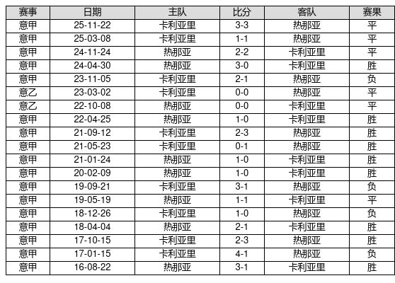 热那亚 VS 卡利亚里两队近10年的交战次数为19场,热那亚9胜6平4负,赢球概率为47.4%,平局概率为31.6%,输球概率为21.1%。