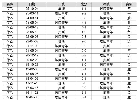 埃因后生 VS 奥斯两队近10年的交战次数为20场,埃因后生6胜5平9负,赢球概率为30.0%,平局概率为25.0%,输球概率为45.0%。