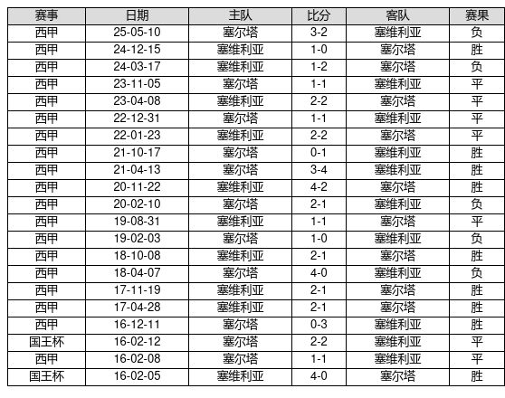 塞维利亚 VS 塞尔塔两队近10年的交战次数为21场,塞维利亚9胜7平5负,赢球概率为42.9%,平局概率为33.3%,输球概率为23.8%。