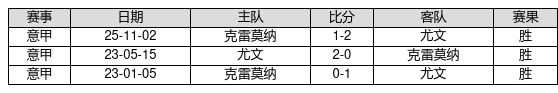 尤文 VS 克雷莫纳两队近10年的交战次数为3场,尤文3胜0平0负,赢球概率为100.0%,平局概率为0.0%,输球概率为0.0%。