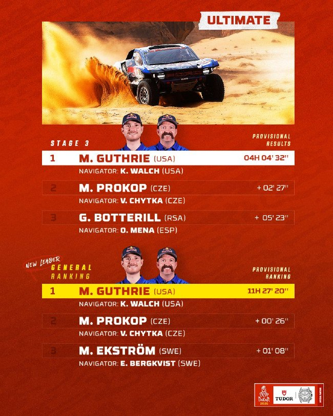 在塞念念·昆特罗(Seth Quintero)夺得赛段冠军后,今天第三赛段冠军通常属于好意思国车手,来自于福特车队的米奇·格念念里(Mitch Guthrie)在宽阔名将遭受爆胎时,他在421km的计时赛段得到干事生活第一个汽车组全场冠军。