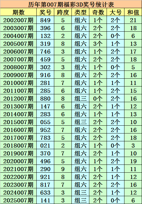 积年第007期福彩3D同时奖号为:849 - 396 - 132 - 319 - 746 - 459 - 302 - 916 - 281 - 285 - 880 - 147 - 283 - 055 - 952 - 783 - 021 - 370 - 496 - 290 - 921 - 817 - 633 - 141。