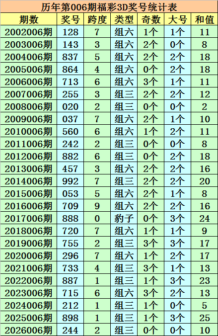 开奖总结:福彩3D第2026006期奖号:244。