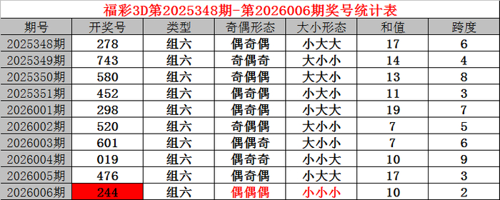 上期回归:福利彩票3D第2026006期开奖着力244。奖号:偶偶偶、小小小,和值10历史直播系统文,跨度2。